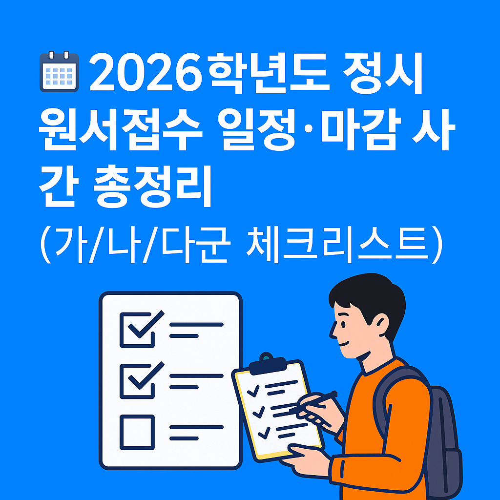 정시는 단 3번의 선택으로 합격을 결정짓습니다. 따라서 마감 시간과 군 배치 전략을 정확하게 알고 준비해야 합니다. 아직 모든 대학이 확정 공지를 내지는 않았지만, 공통 원서접수 방식과 최근 3개년 기준을 토대로 2026 정시 지원 흐름과 핵심 체크를 정리했습니다.📌 목차정시 접수 흐름 이해2026 원서접수 예상 기간대학별 마감 시간 차이가/나/다군 구조 핵심 요약지원 체크리스트가군 전략나군 전략다군 전략마감 시간 관리 방법1️⃣ 정시 접수 흐름 이해수능 성적 확인 → 지원 전략 확정각 군별 1개 대학 선택접수 → 결제 → 접수증 확인원서접수 사이트(진학사/유웨이/대학어디가) 활용※ 동일 모집군 2곳 지원 불가 Apple 2025 아이패드 프로 13(M5 모델) 스탠다드 글래스 - 태블릿PC | 쿠팡..